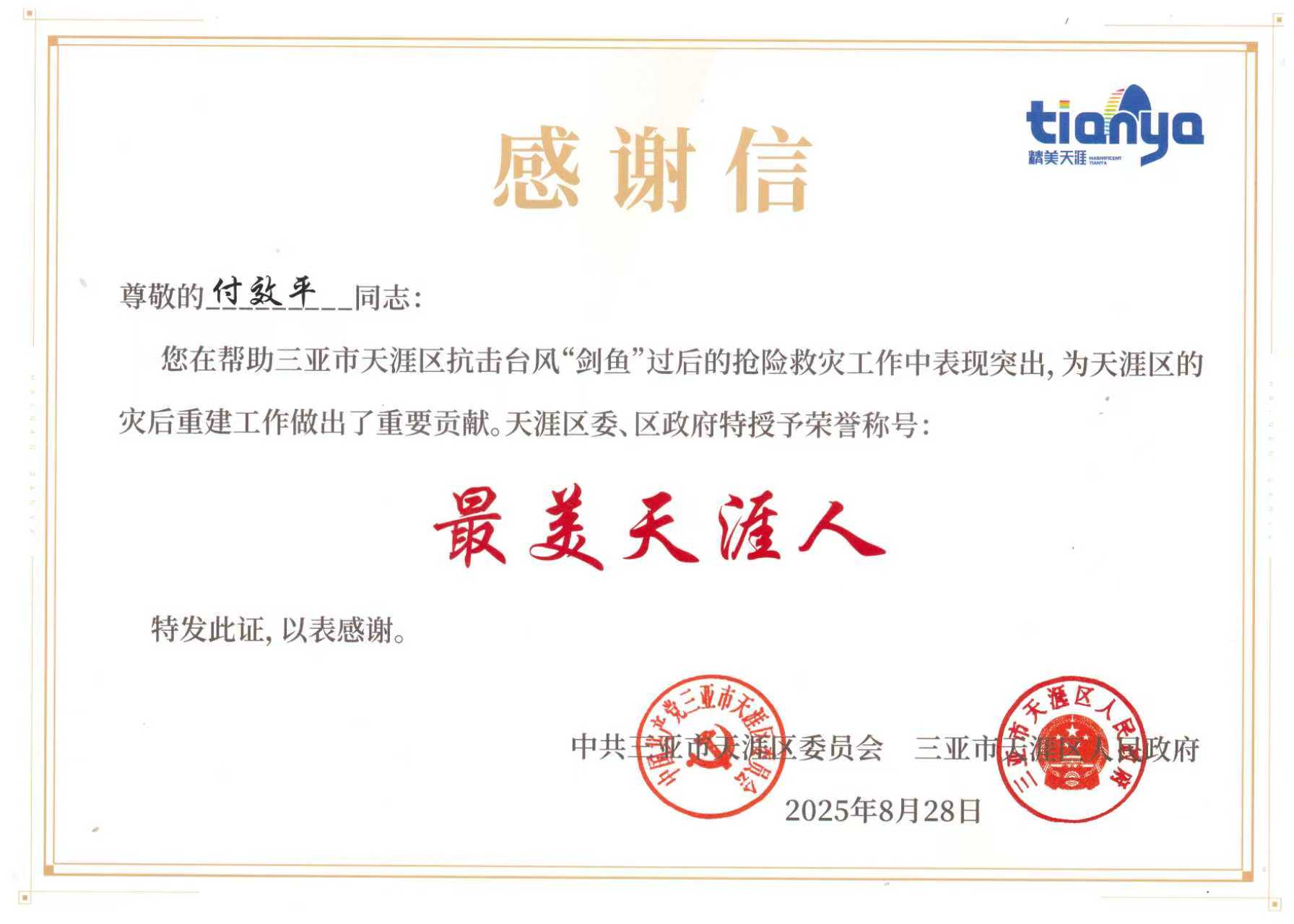 近日,甘肅八建三亞麗景溫泉驛站項(xiàng)目職工付效平、師剛、高福斌等3名職工在抗擊臺(tái)風(fēng)“劍魚(yú)”過(guò)后的搶險(xiǎn)救災(zāi)工作中因表現(xiàn)突出收到感謝信,獲評(píng)“最美天涯人”榮譽(yù)稱(chēng)號(hào)。該榮譽(yù)不僅是對(duì)三名職工抗災(zāi)工作的高度認(rèn)可,更是對(duì)甘肅八建公司深耕地方、踐行企業(yè)社會(huì)責(zé)任、積極樹(shù)立良好品牌形象的有力肯定,為行業(yè)樹(shù)立了企業(yè)與職工協(xié)同發(fā)展、共擔(dān)社會(huì)責(zé)任的典范。